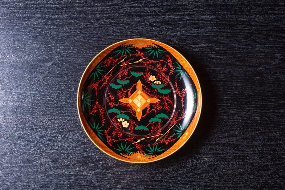 産地として400年以上の歴史を持つ会津ではさまざまな漆器が作られており、独自の技術も生み出されてきました。そのなかでも「会津絵」は金箔を用い、松竹梅や破魔矢などを賑やかにあしらった会津独自の意匠です。江戸後期にはいまに近いスタイルに整い、往時は茶懐石や本膳料理の吸物椀として用いられたと考えられているようです。めでたい吉祥柄はもてなしの席で大いに重宝されたのではないでしょうか。